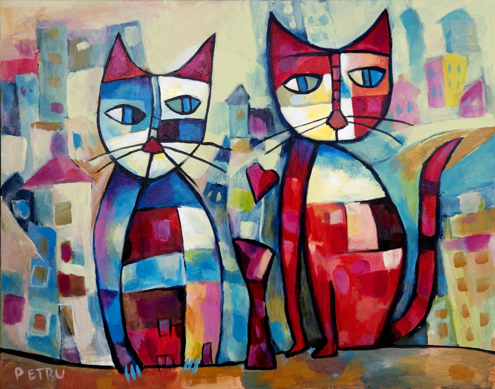In the signature style of Petru Cuciuc, "Uptown Love" seamlessly merges elements of Cubist cityscapes and vibrant figurative expressionism, creating a dynamic interplay between abstract and figurative art. The cats' forms are fractured and reassembled, their outlines blending with the geometric shapes of the cityscape, evoking a sense of movement and energy.