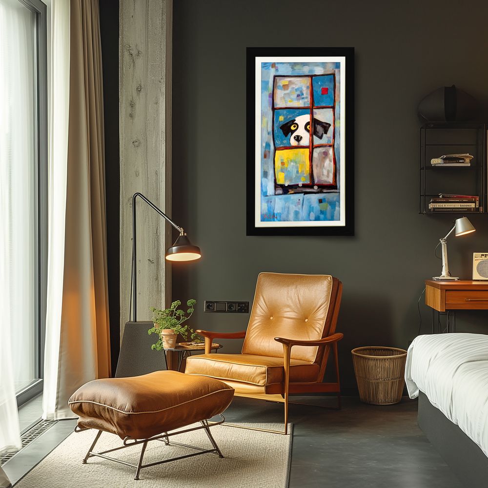 The contrast between the solid, angular forms of the red car and the fluid, colorful cityscape evokes a sense of dynamic motion, while the dog’s happy expression anchors the painting in a moment of pure joy. Every brushstroke adds to the rhythmic energy, transforming the everyday scene of a car ride into a vivid celebration of life, color, and dreams.