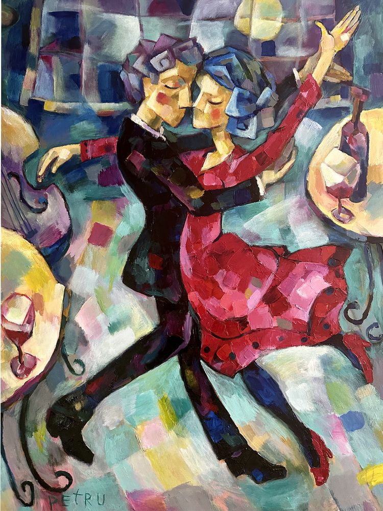 "Wine Room Dance" is a striking 36x48-inch canvas that captures the passion and elegance of a couple immersed in a dramatic, tango-like dance. Painted in the artist's distinctive expressionist style, with accents of Cubism and Fauvism, the scene is alive with vivid colors and dynamic energy. The woman, dressed in a flowing red dress with hints of purple, and wearing red shoes, seems to glide across the floor, her movement so fluid it appears as though she is flying. Her partner, dressed in a black costume accented with shades of red, green, and blue-purple, matches her intensity, their hands extending across the canvas, creating a sense of both romance and dramatism.