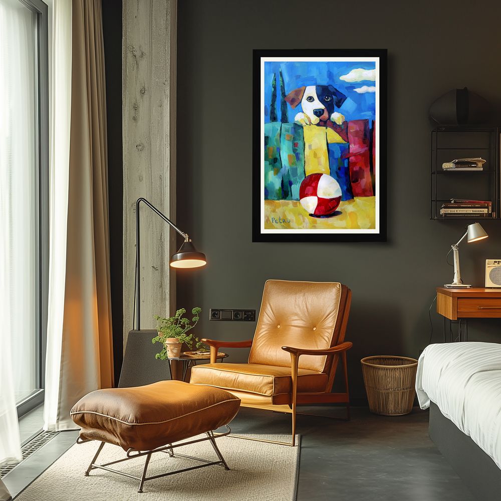 The dog’s form, rendered in dynamic strokes and fractured planes, merges seamlessly with the textured fence, creating an interplay of shapes and shadows. The spherical beach ball, a centerpiece of the painting, stands out with bold patches of complementary colors, drawing the viewer’s eye and balancing the composition’s rhythmic energy. The scene feels both grounded and surreal, as the fence and ball seem to pulse with life, caught between the tangible world and the artist’s expressive imagination.