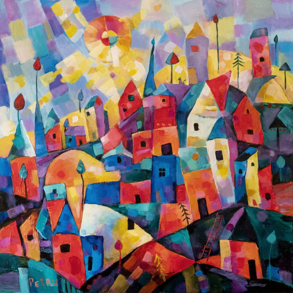 "Sunny Ville" is a vibrant expressionist landscape that transports the viewer to an imaginary village bursting with warmth, color, and life. Painted in Petru Cuciuc’s signature happy Expressionism style, the scene radiates joy through its dynamic composition of pure hues and playful square shapes.