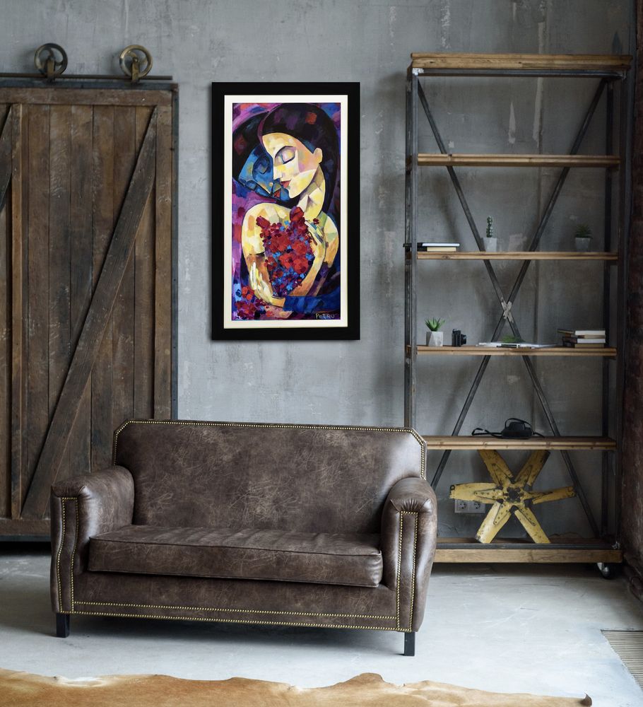 “Purple Kiss” by Petru Cuciuc is a captivating expressionist painting that beautifully captures the essence of love and connection through an intimate embrace. This colorful masterpiece exudes an aura of tenderness, evoking a sense of passion that is both powerful and comforting.