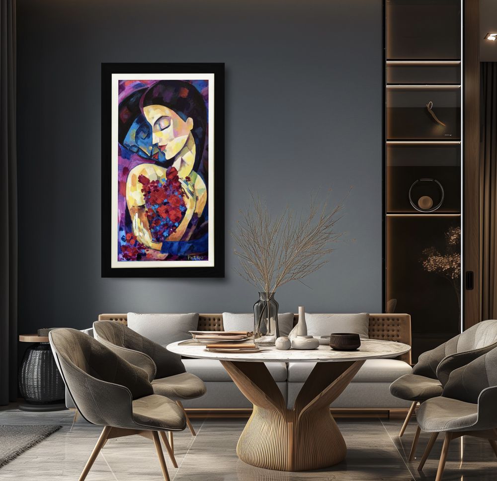 “Purple Kiss” is a celebration of the harmony that can be found in contrasts, demonstrating how different hues can blend together to tell a rich and emotional story. This artwork reminds us that even in moments of intense passion, there exists a sense of calm and balance, much like the tranquility found in nature’s beauty. It is a visual symphony, a testament to the power of love, and a vivid expression of life’s most cherished moments.