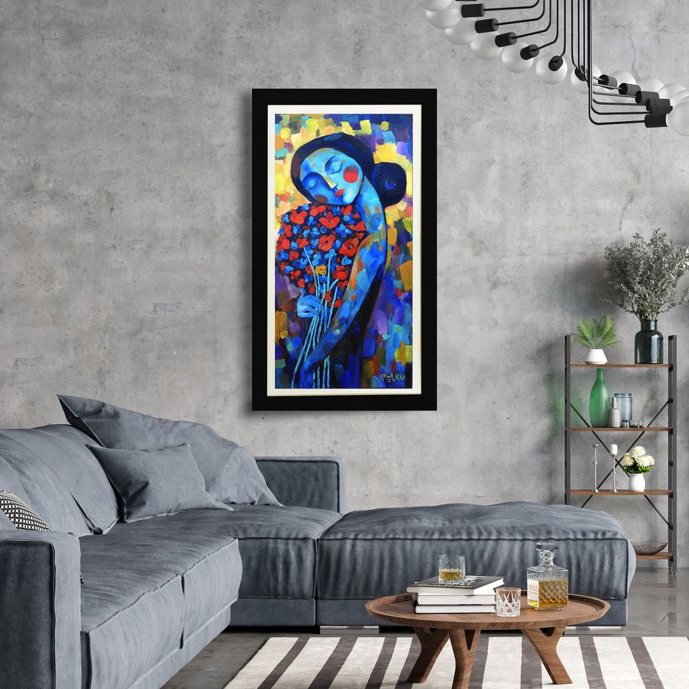 The painting’s palette, dominated by lush blues and bursts of vivid reds, yellows, and purples, creates a captivating interplay of warmth and calm. The woman’s form appears almost ethereal, seamlessly blending with the blossoms she holds, as though she has become one with the beauty of nature itself. The cool, calming background of nuanced blue hues accentuates the brilliance of the flowers, symbolizing a tranquil refuge for the soul amidst life’s vibrant passions.