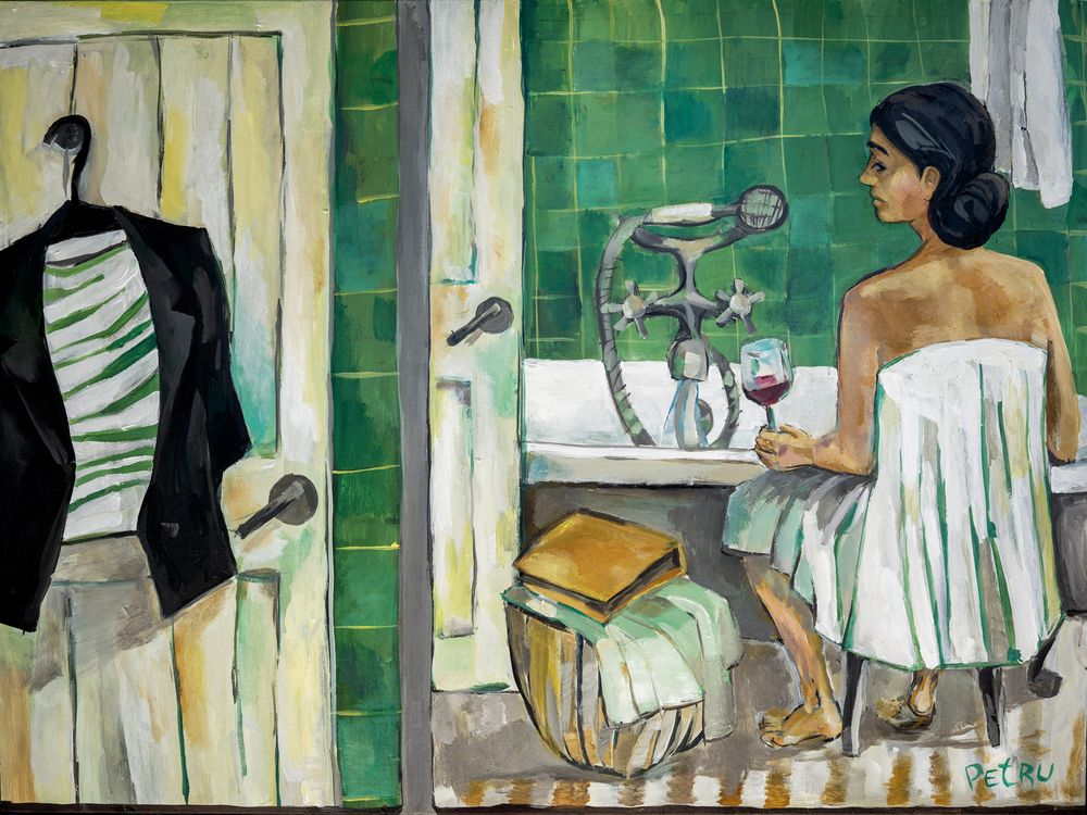 This painting captures a quiet, cinematic story — the moment after a plan fades into stillness. A woman remains by the bathtub, the dress untouched, a glass of red wine replacing the night that might have been.