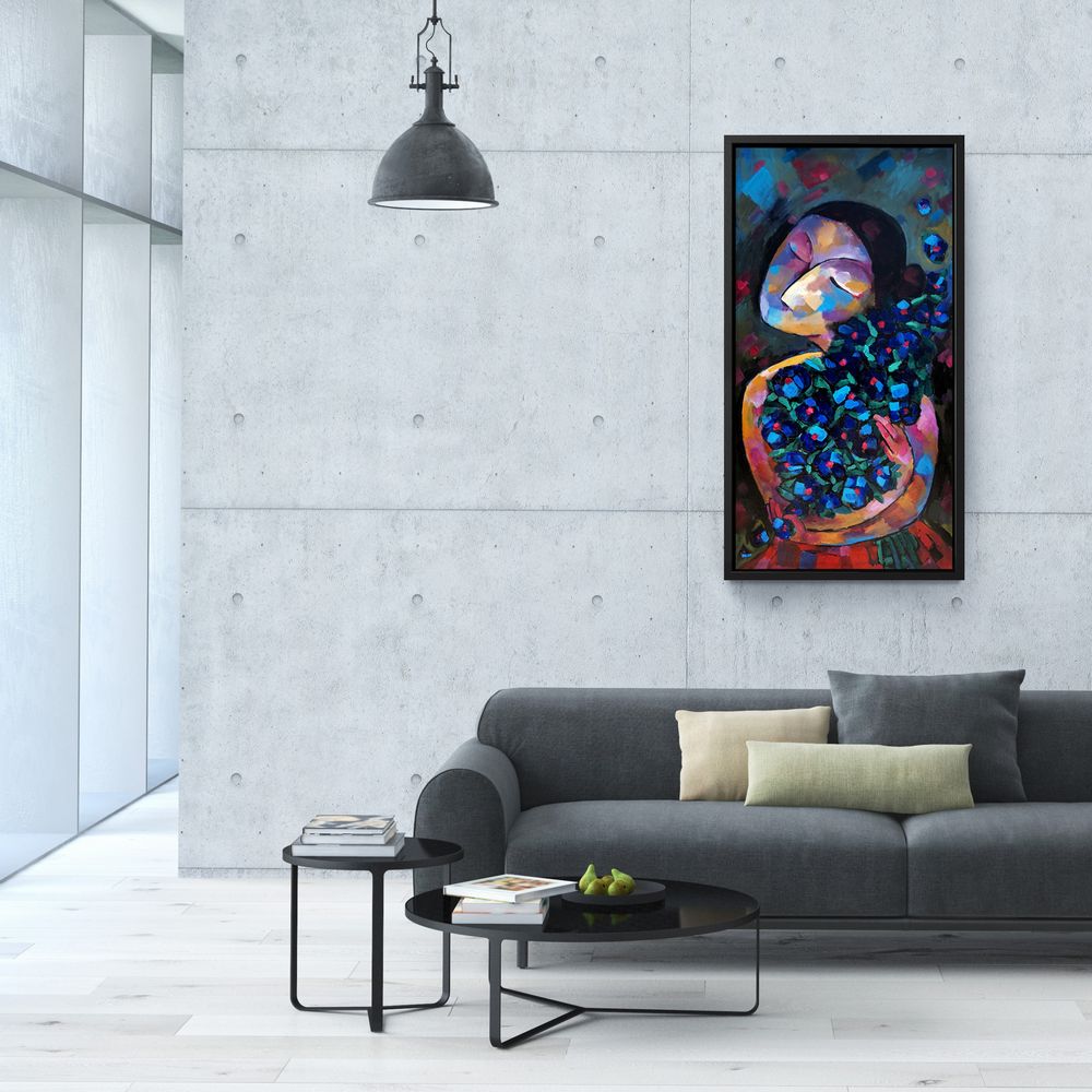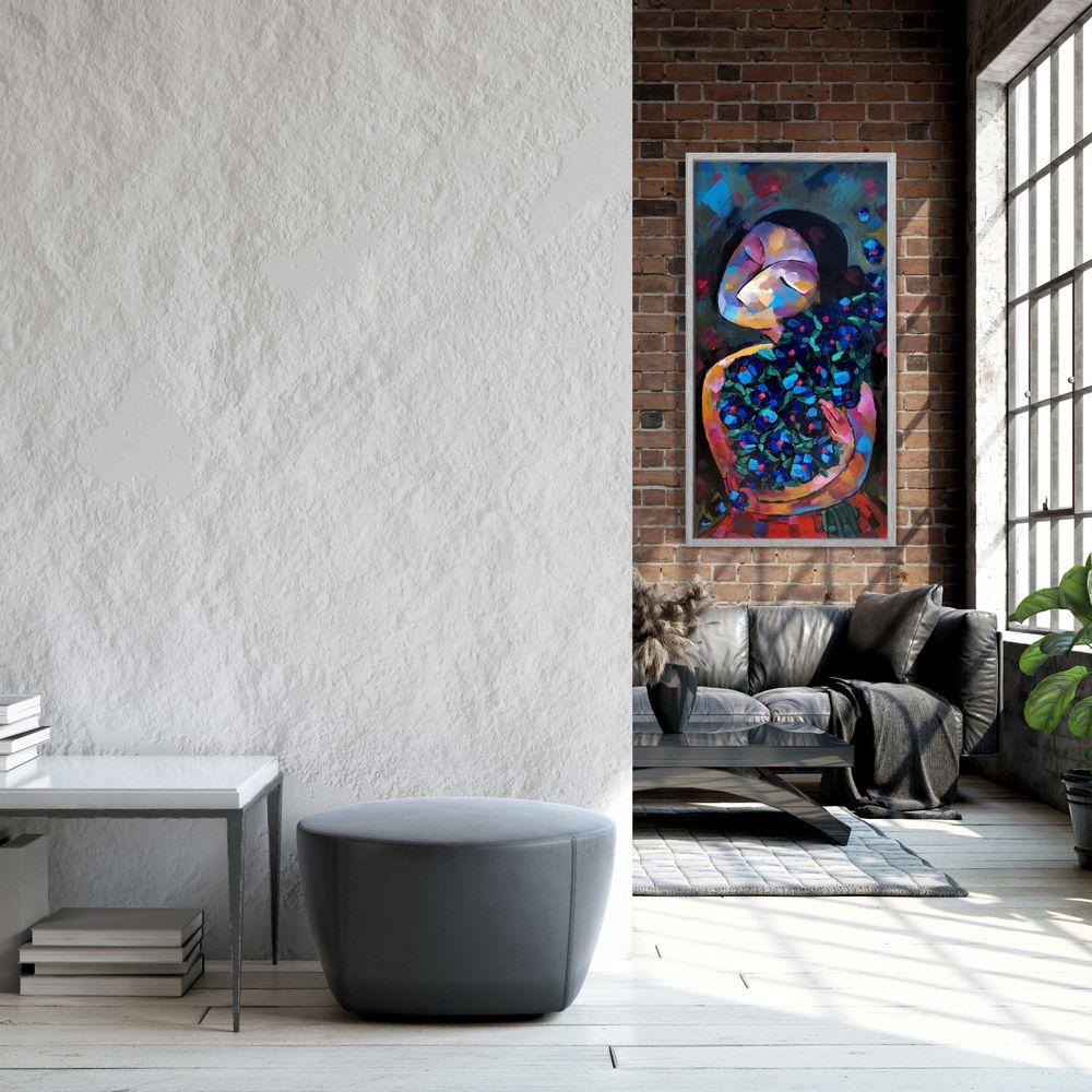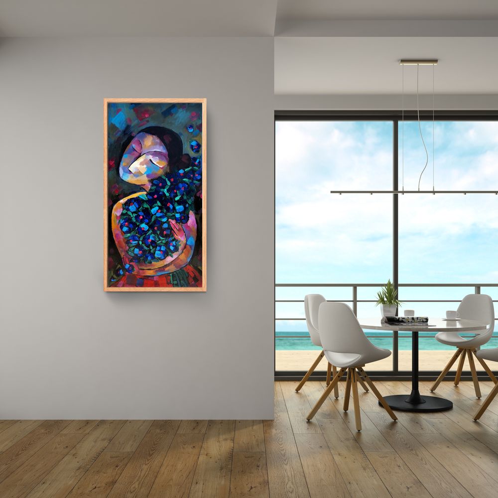 The background is painted in a rich and calming blue nuances, representing the peaceful, calming qualities of nature. The blue flowers that the woman is embracing stand out brilliantly against this backdrop, with shades of red and orange delicately woven into their petals. This strategic use of complementary colors accentuates the intensity of emotion in the painting. The blue and red contrast creates a subtle tension, symbolizing the passionate and fiery nature of love, while the presence of the blue serves to balance and temper these feelings with its cool and calming influence.
