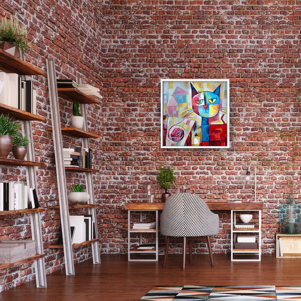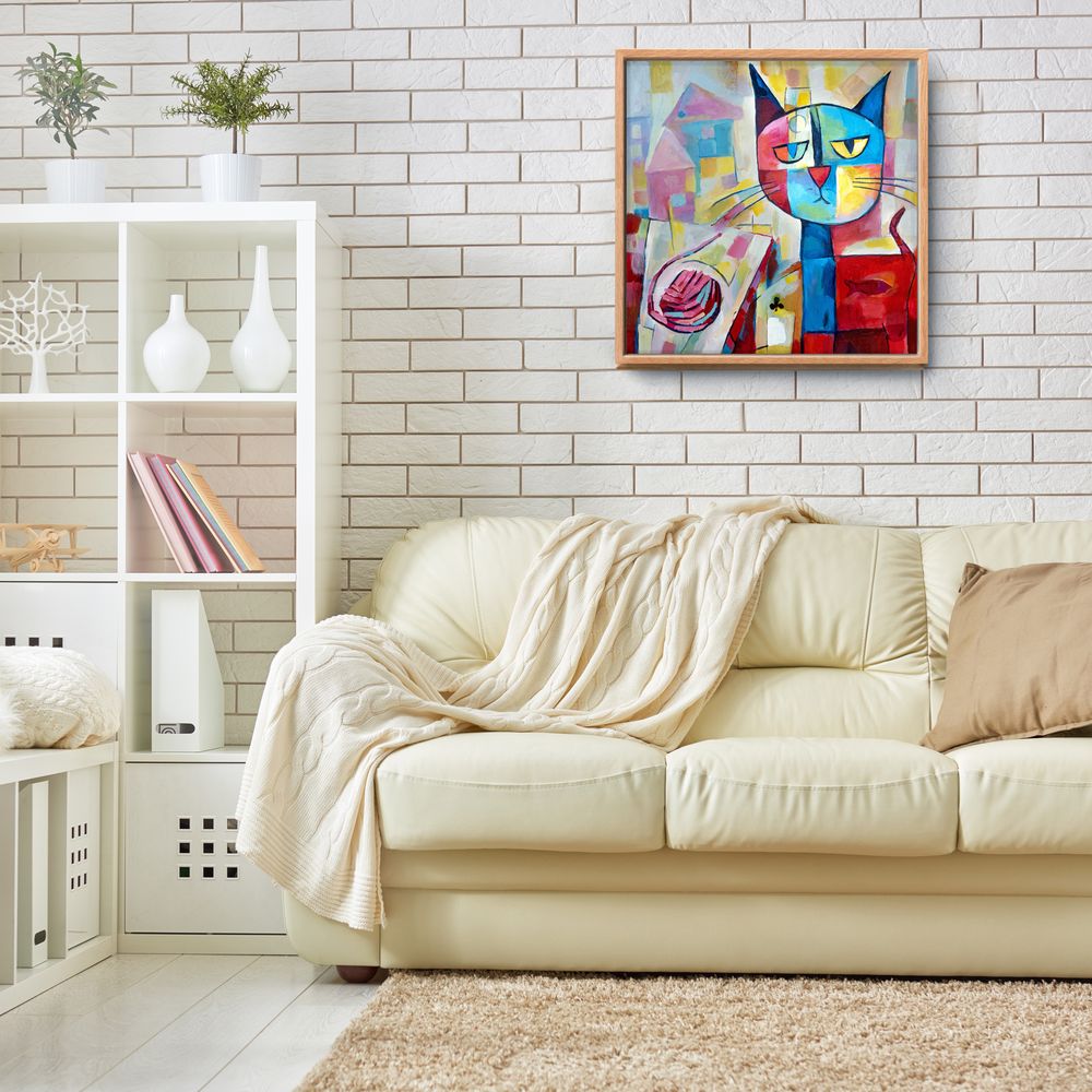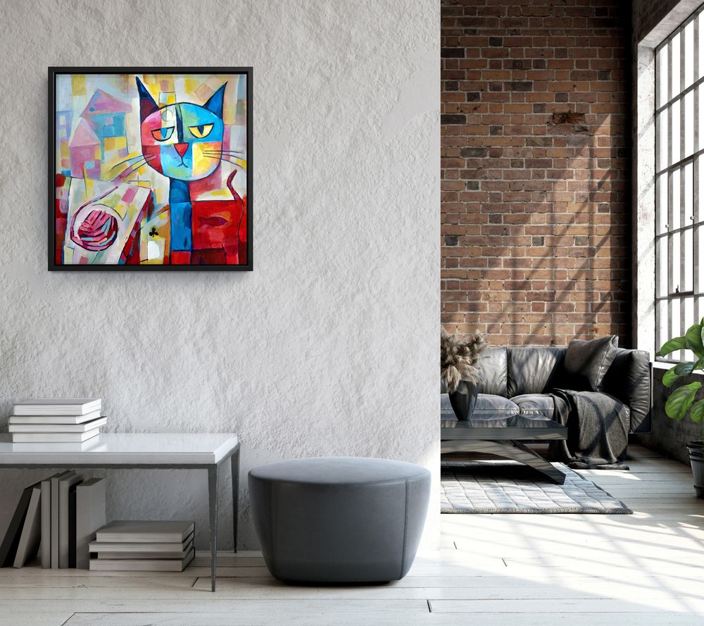 "Lucky Leo" is a captivating painting that transports viewers into a surreal tableau where the boundaries between reality and imagination blur. Within this vibrant composition, a cat are depicted in a unique and whimsical manner. The cat appears to contain the fish within its form, creating a playful and enigmatic scene. Nearby, a ball of thread adds a touch of domesticity to the surreal landscape.