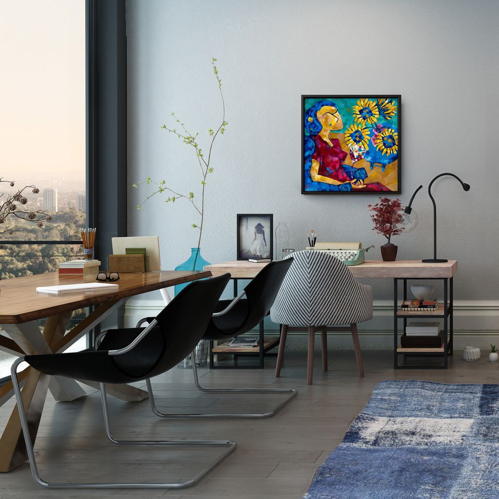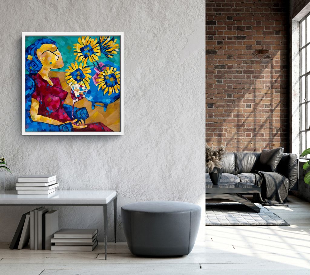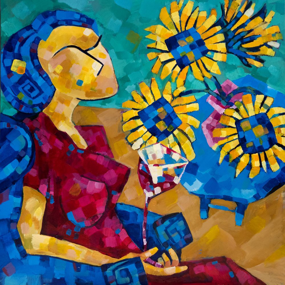 A Sunflower Serenade,' an enchanting fusion of expressionism, cubism, and fauvism unfolds gracefully as a lady adorned in a resplendent red gown reclines in a luxurious blue armchair, gracefully holding a glass of deep red wine. The canvas breathes with tranquility, inviting onlookers into a realm where the harmonious interplay of colors creates a sanctuary of peace and joy.