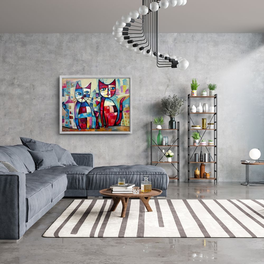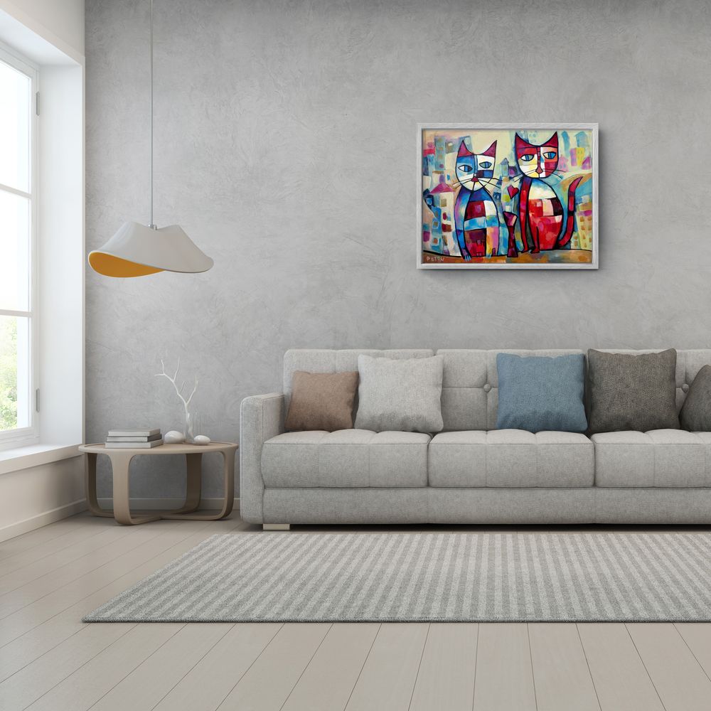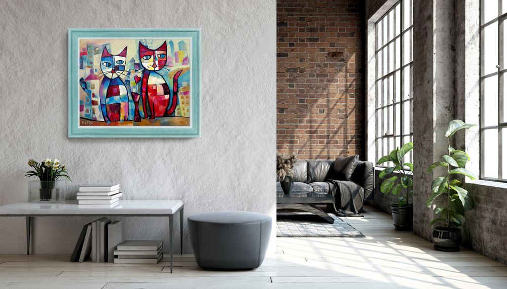 The painting invites viewers into a world where diverse shapes and colors come together to tell a captivating story. The juxtaposition of the cats against the abstract cityscape speaks to the universal theme of love found amidst the chaos of urban life, inviting contemplation and reflection.