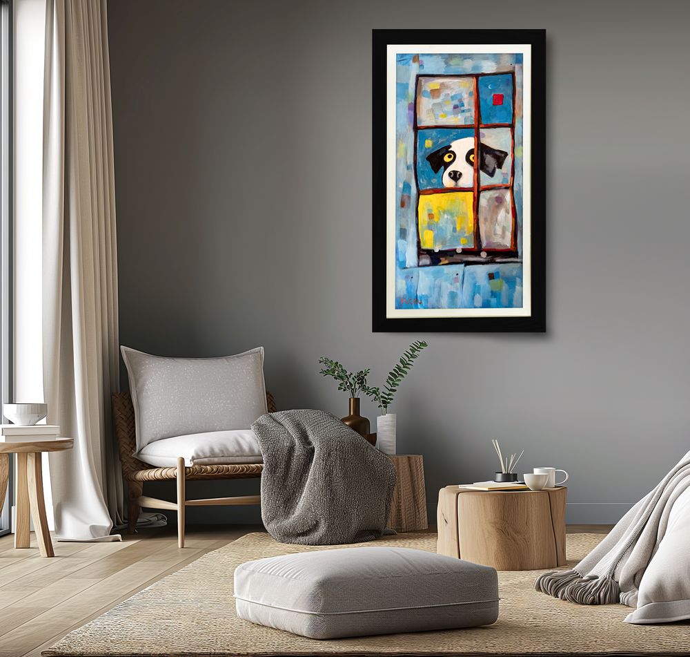 The contrast between the solid, angular forms of the red car and the fluid, colorful cityscape evokes a sense of dynamic motion, while the dog’s happy expression anchors the painting in a moment of pure joy. Every brushstroke adds to the rhythmic energy, transforming the everyday scene of a car ride into a vivid celebration of life, color, and dreams.