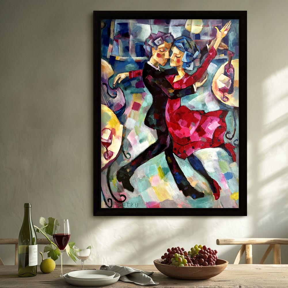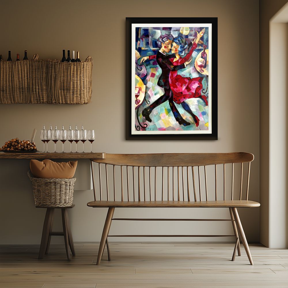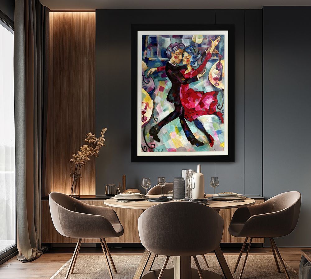 "Wine Room Dance" is a striking 36x48-inch canvas that captures the passion and elegance of a couple immersed in a dramatic, tango-like dance. Painted in the artist's distinctive expressionist style, with accents of Cubism and Fauvism, the scene is alive with vivid colors and dynamic energy. The woman, dressed in a flowing red dress with hints of purple, and wearing red shoes, seems to glide across the floor, her movement so fluid it appears as though she is flying. Her partner, dressed in a black costume accented with shades of red, green, and blue-purple, matches her intensity, their hands extending across the canvas, creating a sense of both romance and dramatism.