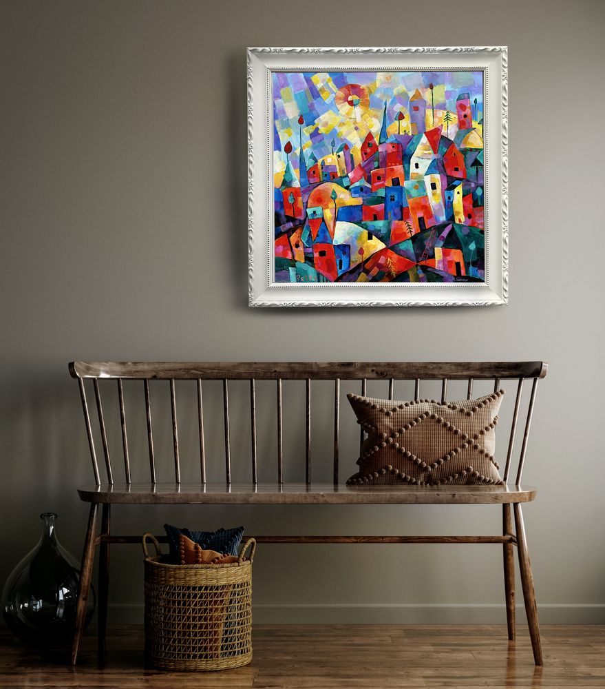 "Sunny Ville" is more than a landscape—it is a celebration of light, color, and imagination. Through bold strokes and a vivid palette, the painting invites viewers into a world of pure joy, where every shape and hue sings in harmony, reminding us of the beauty in simplicity and the warmth of life’s most colorful moments.