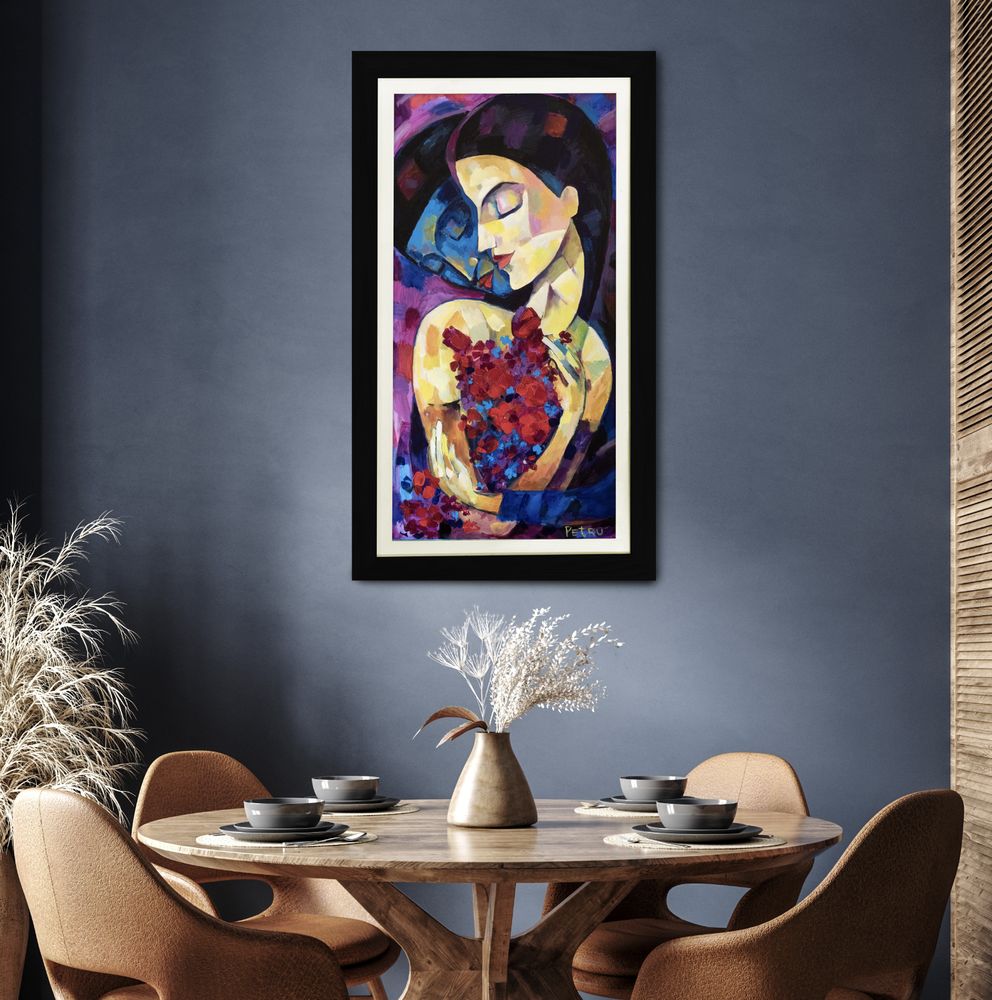 “Purple Kiss” by Petru Cuciuc is a captivating expressionist painting that beautifully captures the essence of love and connection through an intimate embrace. This colorful masterpiece exudes an aura of tenderness, evoking a sense of passion that is both powerful and comforting.