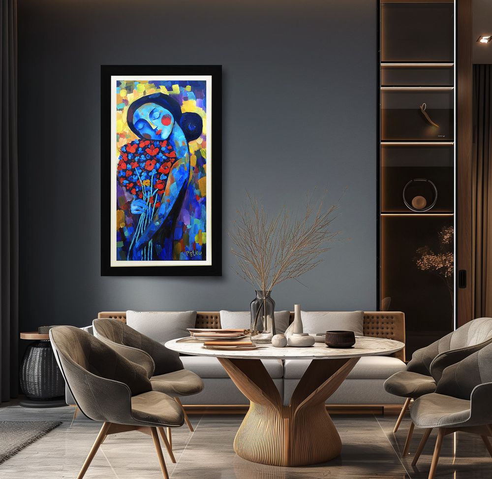 The painting’s palette, dominated by lush blues and bursts of vivid reds, yellows, and purples, creates a captivating interplay of warmth and calm. The woman’s form appears almost ethereal, seamlessly blending with the blossoms she holds, as though she has become one with the beauty of nature itself. The cool, calming background of nuanced blue hues accentuates the brilliance of the flowers, symbolizing a tranquil refuge for the soul amidst life’s vibrant passions.