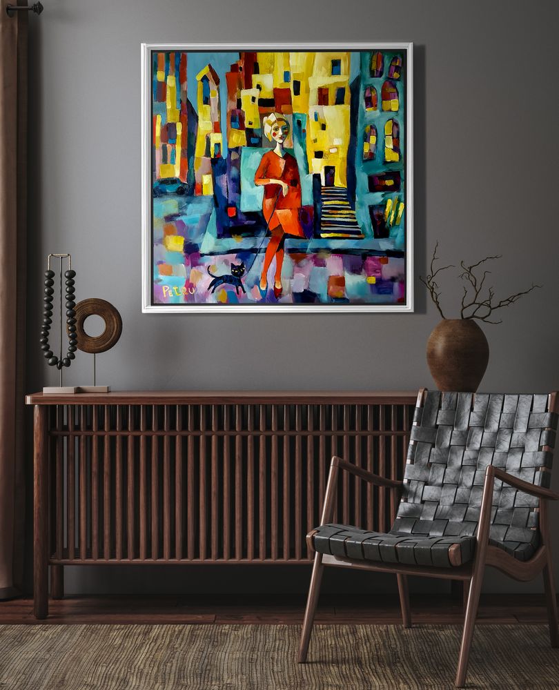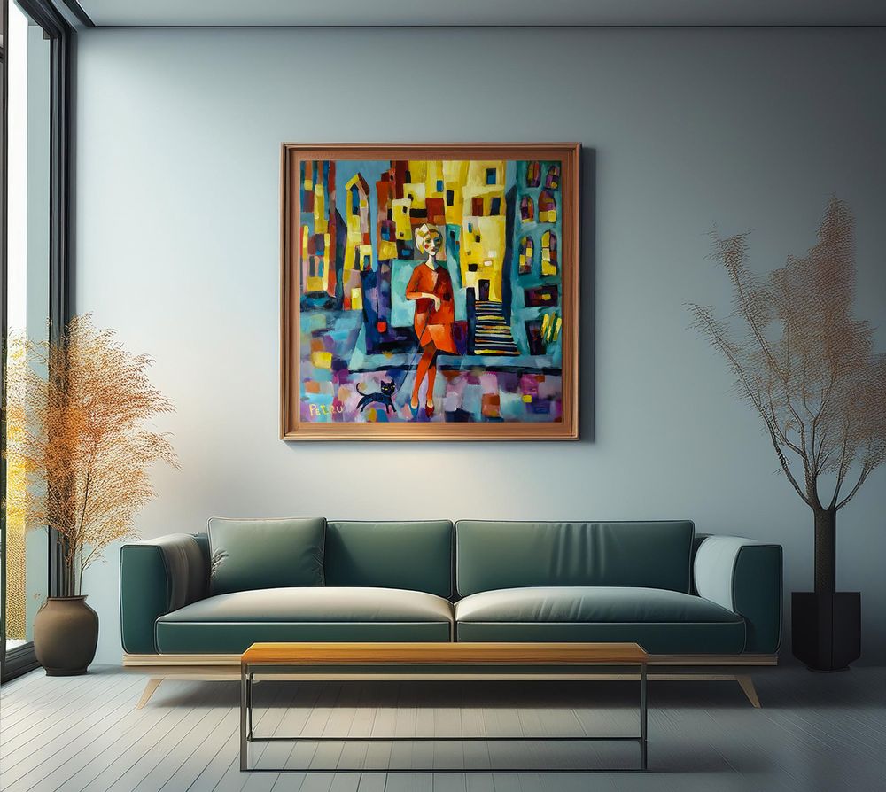 "City Walk" is a tribute to confidence, beauty, and the magic of city life. With its glowing palette, elegant movement, and harmonious composition, the painting transforms an ordinary walk into a timeless celebration of color, style, and New York’s ever-pulsing soul.