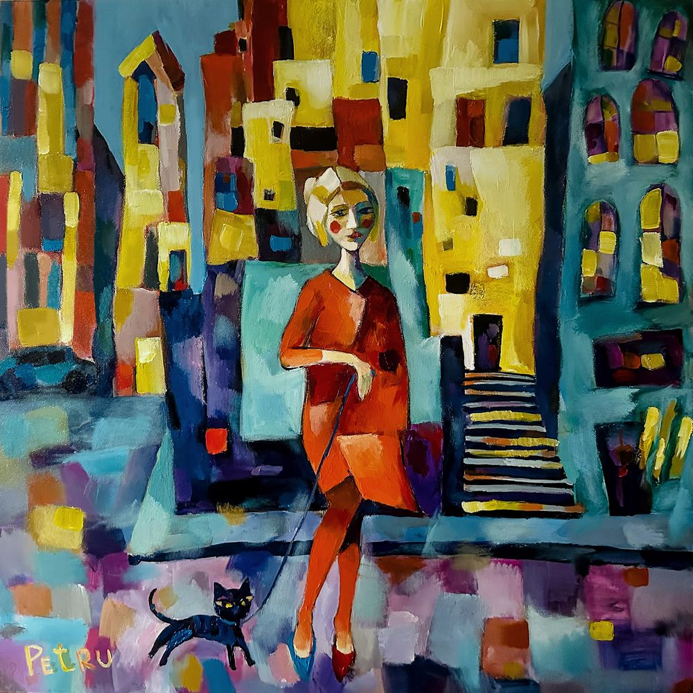 "City Walk" captures the vibrant essence of New York City through Petru Cuciuc’s signature happy Expressionism, infused with hints of Cubism and Surrealism. Dominated by glowing yellows and rich purples, the painting transforms the urban landscape into a dreamlike mosaic of light, color, and energy.