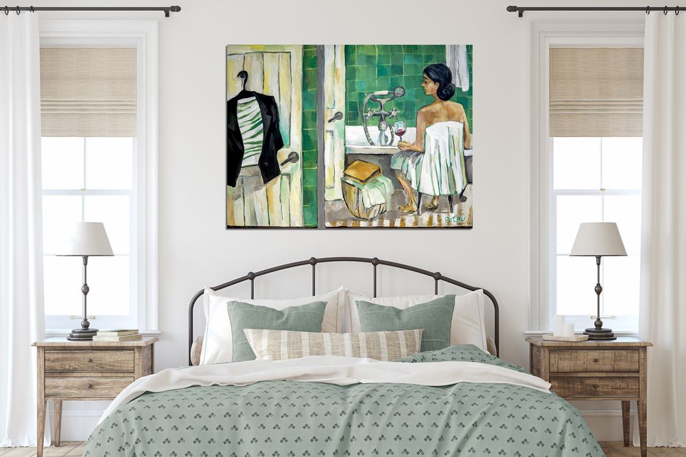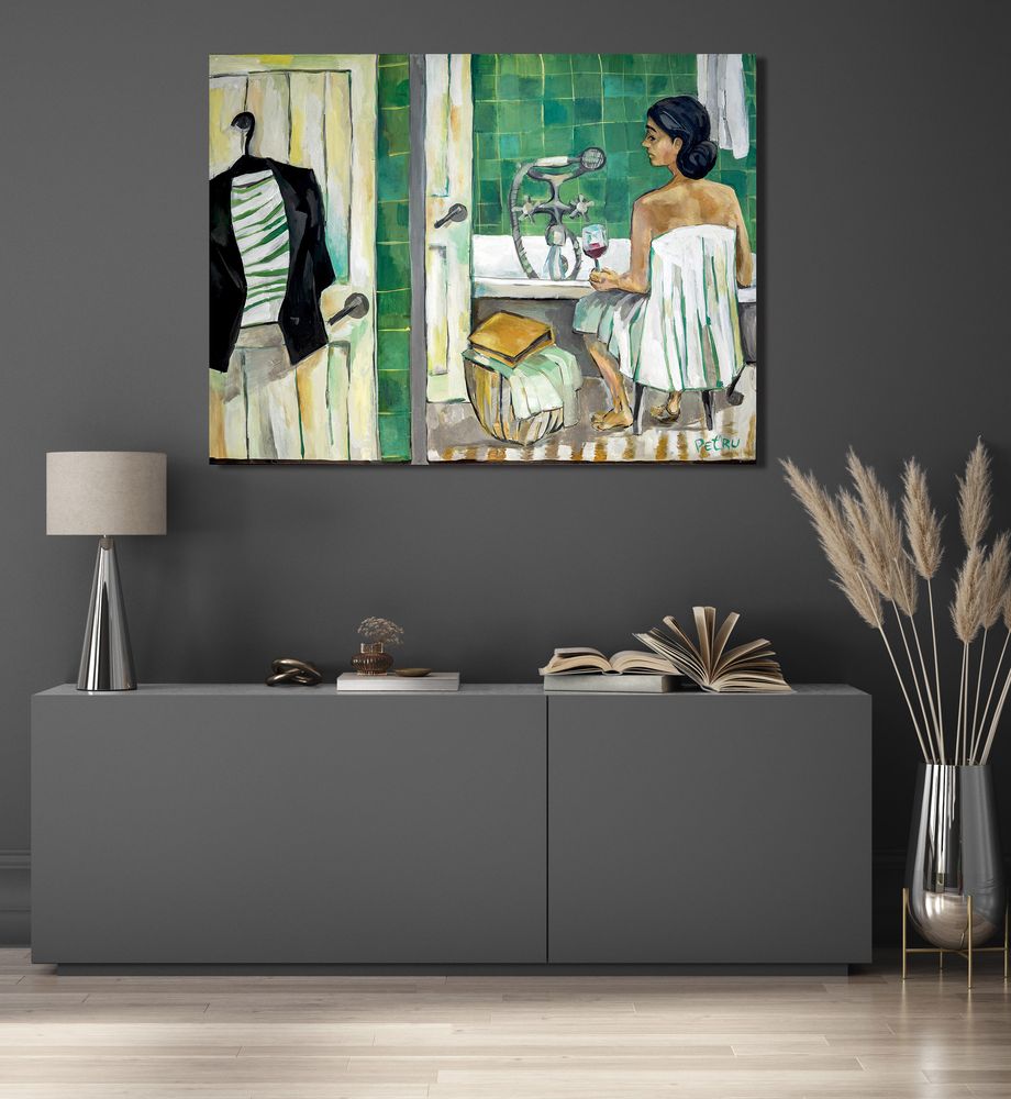This painting captures a quiet, cinematic story — the moment after a plan fades into stillness. A woman remains by the bathtub, the dress untouched, a glass of red wine replacing the night that might have been.