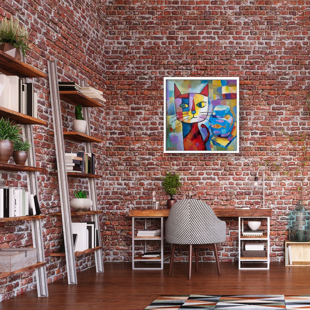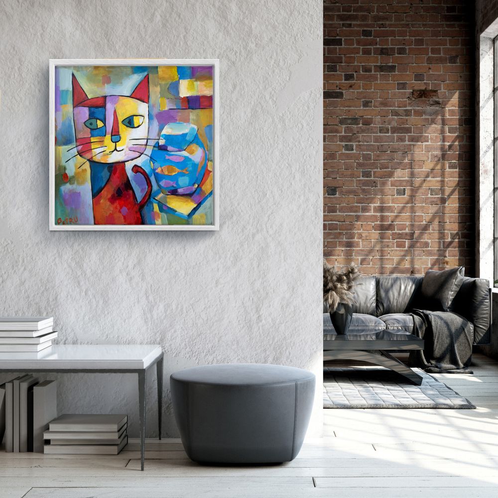 ”Luna's Lure" is a mesmerizing oil painting that dances with vibrant hues and expressive forms, reminiscent of the Cubist portraits but infused with the rich tradition of Planar Expressionism. At its core lies a captivating scene where a cat lounges beside a vase filled with fish, each element rendered in bold strokes of magenta, red and blue.